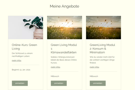Um ihre Vision möglichst vielen Menschen näher zu bringen, hat Anna Pribil 2020 einen umfassenden Online-Kurs „Green Living. Der Schlüssel zu einem nachhaltigen Leben.“ erstellt. Zweimal wurde der Kurs bereits online abgehalten, nun steht er auf der Plattform Teachable gemeinsam mit einem Workbook mit Übungen für rund € 70,– zur Verfügung. So kann jede*r im eigenen Tempo die folgenden fünf bzw sechs Module bearbeiten.