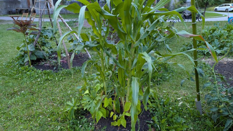 Mais: Ausgewachsen ein strammer Kerl, ist er für die anderen perfekte Rankhilfe, Stütze und Windschutz in einem; Flachwurzler