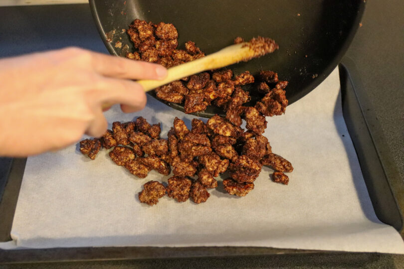 Kurz bevor das Wasser weg ist (die Masse schäumt dann), den Herd auf mittlere Hitze zurückstellen (Zucker verbrennt sonst und wird bitter). Zuerst wird der Zucker sehr trocken, unbedingt weiterrühren, bis der Zucker wieder leicht zu schmelzen beginnt (karamellisiert) und die Nüsse glänzen. Jetzt heißt es cool bleiben. Am besten machen das die jungen Männer in der Familie. 😉