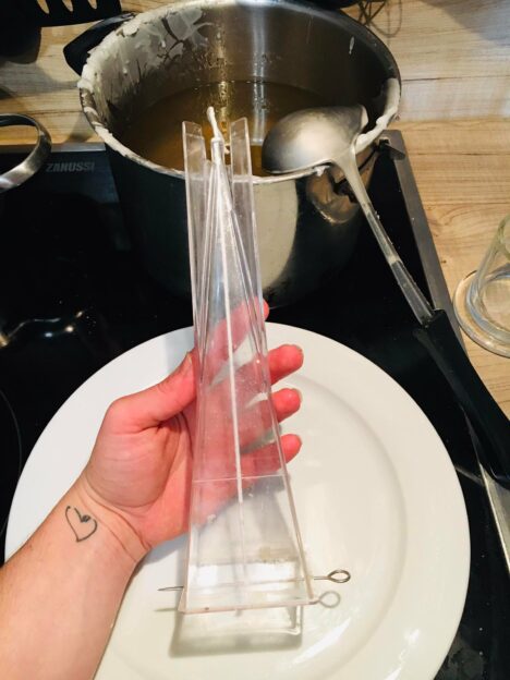 - Als Nächstes wird die Dochthalterung entfernt und die Kerze/n soll weitere 6 Stunden ganz abkühlen. Danach löst man den Knoten vom Docht und löst die Kerzen vorsichtig aus den Formen.