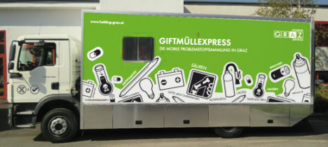 Der Giftmüllexpress ist die mobile Problemstoffsammlung der Stadt Graz und wird von der Holding Graz Services durchgeführt. Der große auffällige Lastwagen tourt immer an 3 Tagen in der Woche durch die verschiedenen Grazer Bezirke und macht an 65 verschiedenen Standorten Halt.