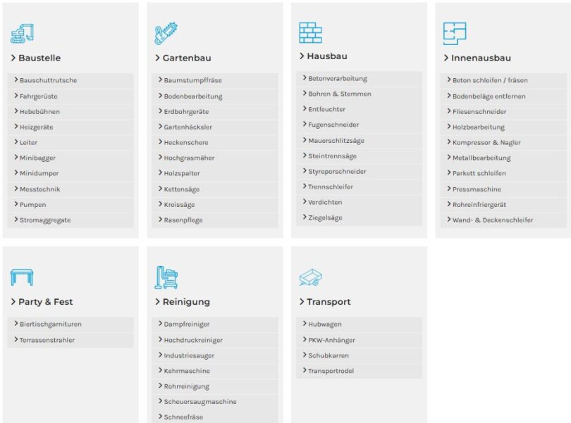 Der Schwerpunkt liegt auf Maschinen und Geräten, die man typischerweise nur gelegentlich braucht – ideal, um sie zu leihen statt zu kaufen. Liste Verleih & Mietpreisliste