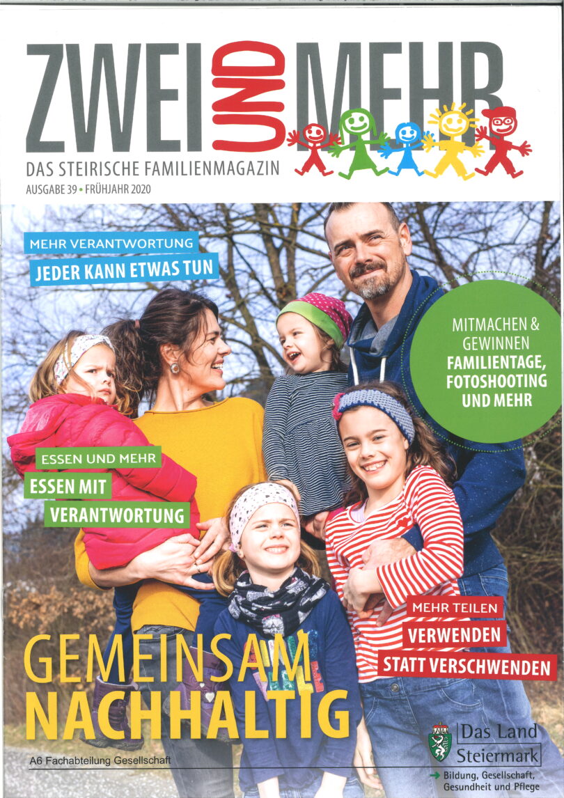 18.03.2020: Die Frühjahrsausgabe 2020 des ZWEI&MEHR, dem Steirischen Familienmagazin widmet sich ganz dem wichtigen Thema NACHHALTIGKEIT. Auf den Seiten 20/21 des aktuellen Heftes kommt auch Bea von Nachhaltig in Graz zu Wort.
