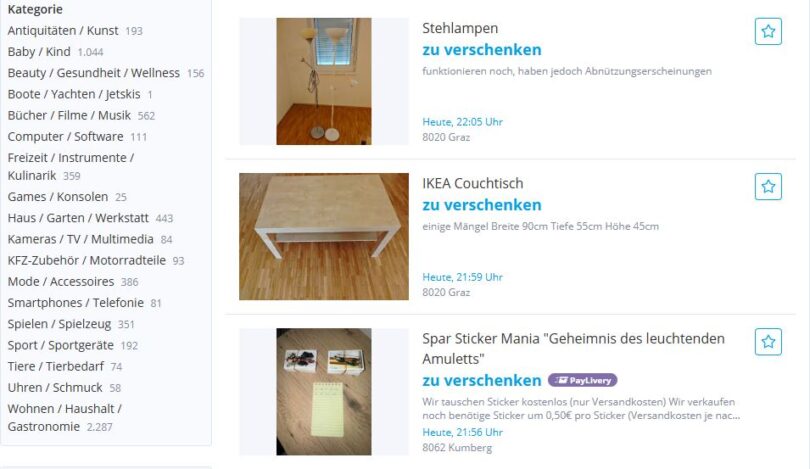 Ein besonderes Highlight auf Willhaben ist die Rubrik „zu verschenken“. Sie ermöglicht es, Dinge, die man selbst nicht mehr benötigt, ohne finanziellen Anreiz und besonders niederschwellig weiterzugeben. Das ist vor allem dann sinnvoll, wenn der Verkaufswert gering ist oder der soziale Gedanke im Vordergrund steht.
