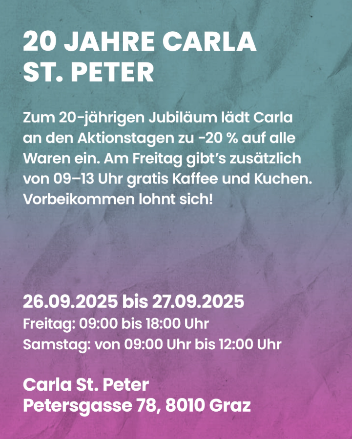 Zum 20-jährigen Jubiläum lädt Carla an den Aktionstagen zu -20% auf alle Waren ein. Am Freitag gibt’s zusätzlich von 9-13 Uhr gratis Kaffee und Kuchen. Vorbeikommen lohnt sich!