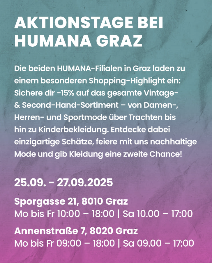 Die beiden HUMANA-Filialen in Graz laden zu einem besonderen Shopping-Highlight ein: Sichere dir – 15% auf das gesamte Vintage- & Second-Hand-Sortiment – von Damen-, Herren- und Sportmode über Trachten bis hin zu Kinderbekleidung. Entdecke dabei einzigartige Schätze, feiere mit uns nachhaltige Mode und gib Kleidung eine zweite Chance!