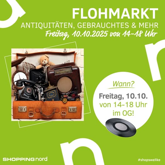 Das Shopping Nord Flohmarkt-Wochenende wartet auf dich! Am Freitag, 10.10.2025 von 14-18 Uhr klassischer Flohmarkt mit Antiquitäten & Gebrauchtem + am Samstag, 11.10.2025 von 9-14 Uhr der traditionelle Spielzeug-Flohmarkt für die ganze Familie!