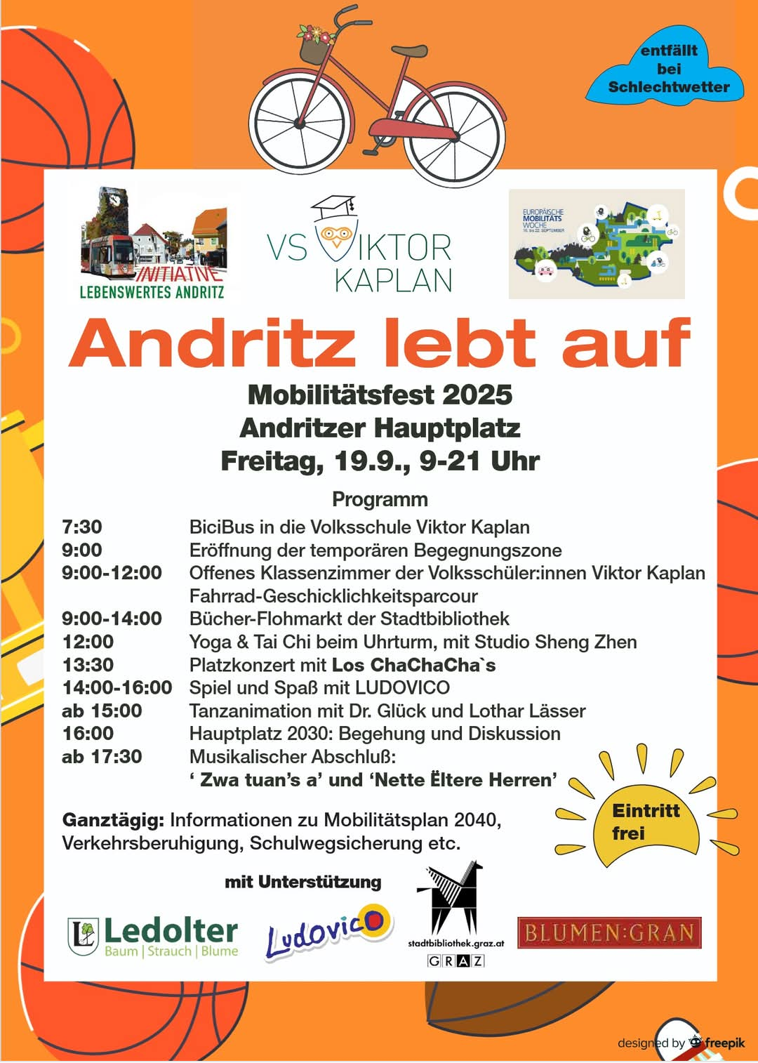 - 09.00 bis 12.00: Offenes Klassenzimmer der Volksschüler:innen Viktor Kaplan mit einem Fahrrad-Geschicklichkeitsparcour