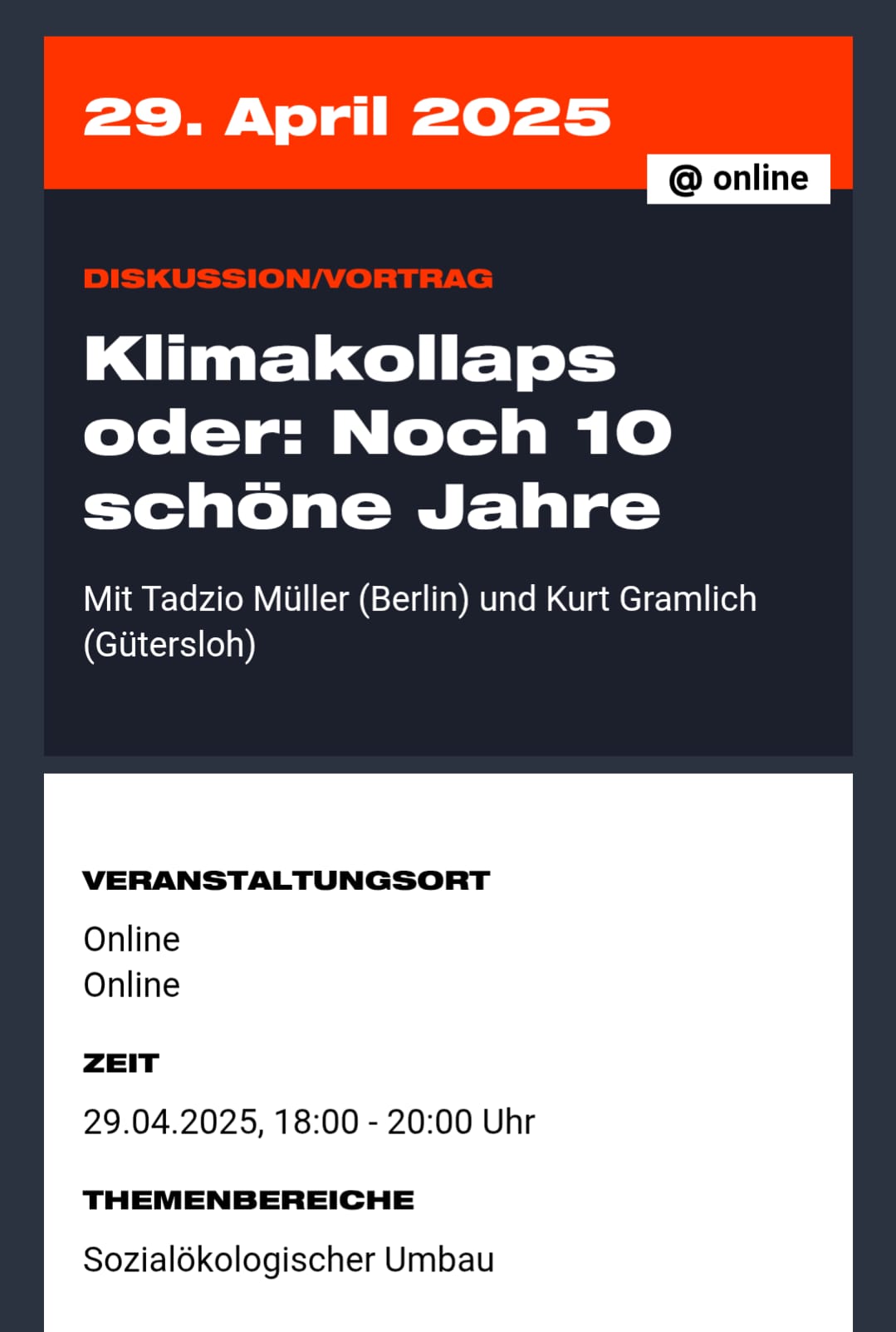 Klimakollaps oder noch zehn schöne Jahre? Über diese und andere Fragen diskutieren zwei langjährige Klimaaktivisten. Die Bandbreite reicht vom aktivistisch-medial präsenten bis zum kommunal-institutionell verorteten Engagement. Im Gespräch sollen ihre Zugänge zum Thema, ihre Beweggründe fürs Dranbleiben, ihre Zweifel ob eines guten Endes und die Argumente für ein Weitermachen im Mittelpunkt stehen.