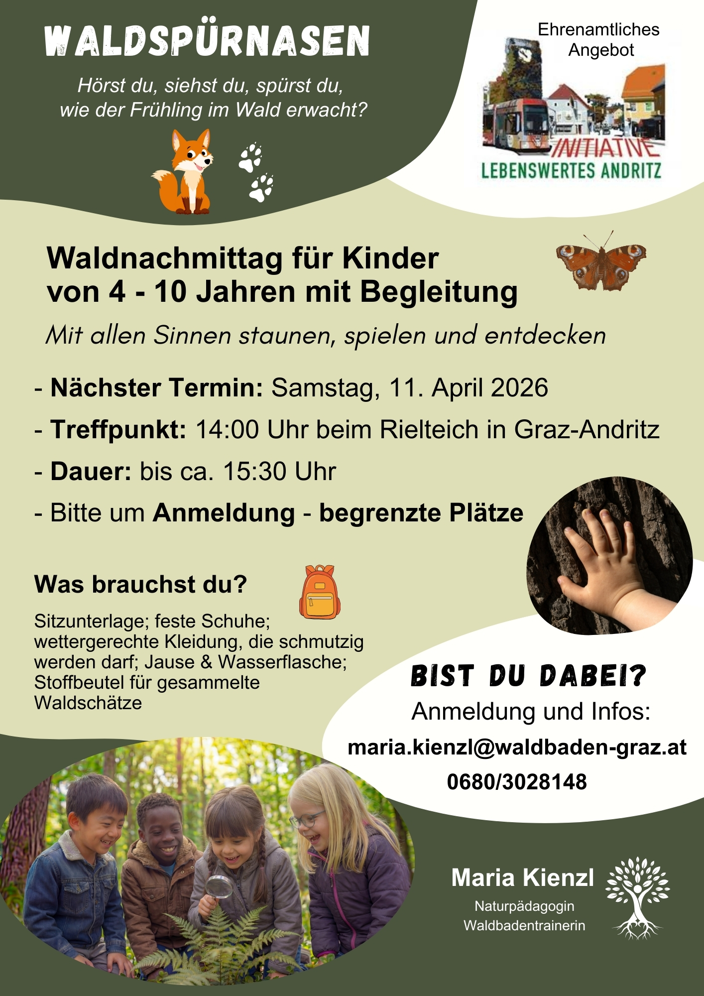 Die Initiative Lebenswertes Andritz lädt am Samstag, 11. April 2026, wieder zu einem Walderlebnistag für alle Kinder von 4 bis 10 Jahren in Graz-Andritz ein .